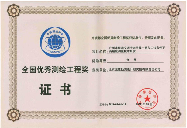 勘测院不但在科技创新方面潜力无限,所承揽的工程项目也规模庞大,并以打造精品工程为标准、业主满意为目标,争分夺秒、攻坚克难,我院《广州市轨道交通十四号线一期多工法条件下高精度测量技术研究》项目获得全国优秀测绘工程奖金奖,该奖项称得上测绘行业顶尖大奖。此工程投资189.13亿元,线路全长54.4km,测量工作达五年之久,我院投入大量经验丰富、专业能力强的工程管理人员和技术骨干到一线,广州分院院长李鹏亲自上阵,项目主力周小波、张殿、张志宏等数十人认真负责,在线路长、工期长及环境复杂的条件下,解决多级测量控制网测设及维护工作,实现高精度,高质量的测量目标,并于2013年首次在广州地铁应用北斗系统对首级GPS控制网进行验证,为后续北斗系统在轨道交通建设中的应用积累了经验。《天津地铁5、6号线工程安全风险监控平台、监测总体及1合同段现场监测》项目也荣获中国地理信息产业优秀工程奖金奖等。