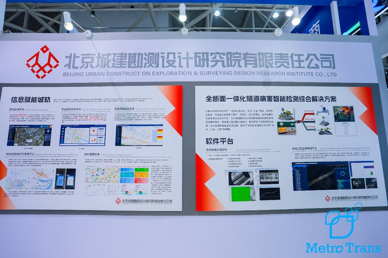 本届展会北京城建勘测院展示了“全断面一体化隧道病害智能检测综合解决方案和设备”、“中低速磁浮轨道交通关键技术及应用”、“城市轨道交通空天地一体化智能检养修技术”、“深基坑短路径降水回灌一体化技术”等本院自主研究的新技术、新装备。