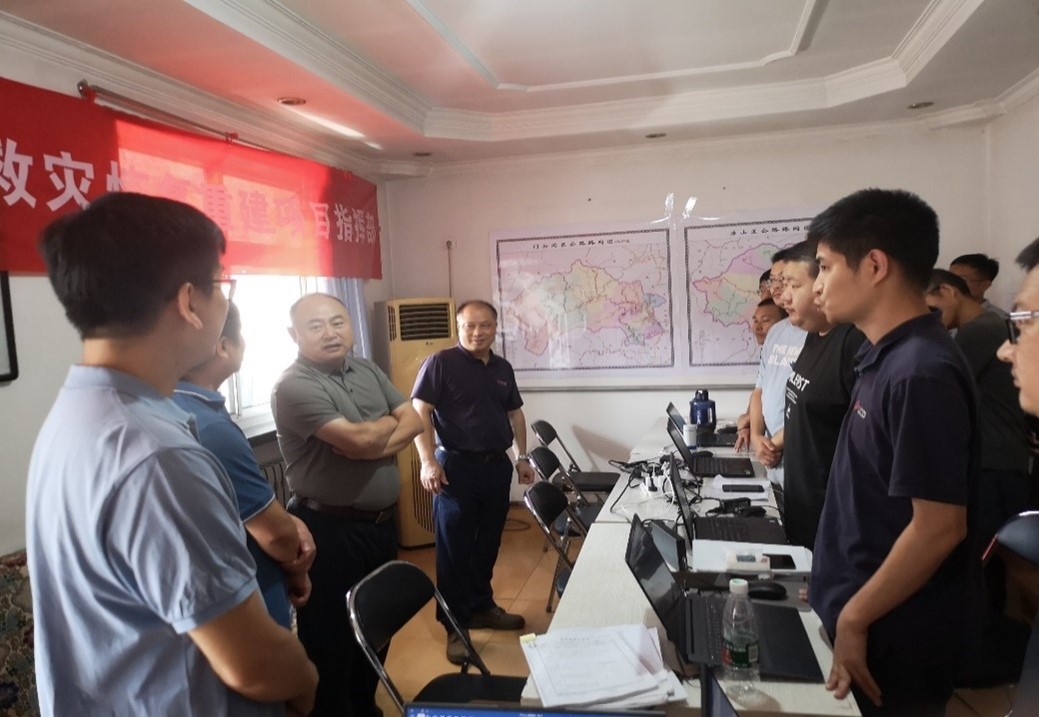8月15日,北京城勘院院长王思锴、副院长刘志强前往门头沟清水镇抢险一线办公,现场协调增派技术骨干、机械设备及后勤保障力量。退休顾问专家马雪梅、冯科明一同前往,详细查看受灾情况,现场指导勘察、测绘工作。