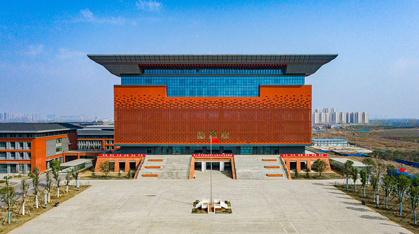 洛阳职业技术学院新校区一期一组团图文信息中心及地下车库项目采取汉魏建筑风,采用“双幕墙系统+围合式八层通高中庭”,钢结构外挑形成飞檐骨架,总建筑面积59985.88平方米,是集借阅研究、管理设备、咨询服务、学术交流、信息中心、电子文献、行政办公等9大功能区于一体的综合性图书馆。