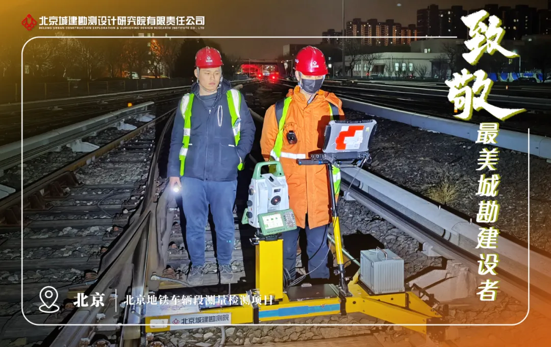 由北京城勘院测量专业院承揽的北京地铁车辆段测量检测项目涉及地铁9号线、10号线、亦庄线、昌平线共计7个场段,面对碎石道床轨道线型复杂、工期紧张、技术要求高等挑战,技术团队创新应用“全站仪+惯导小车”智能测量方法,实现高精度数据采集。他们昼夜穿梭于轨道间,用汗水与智慧,守护着地铁列车的安全运行。