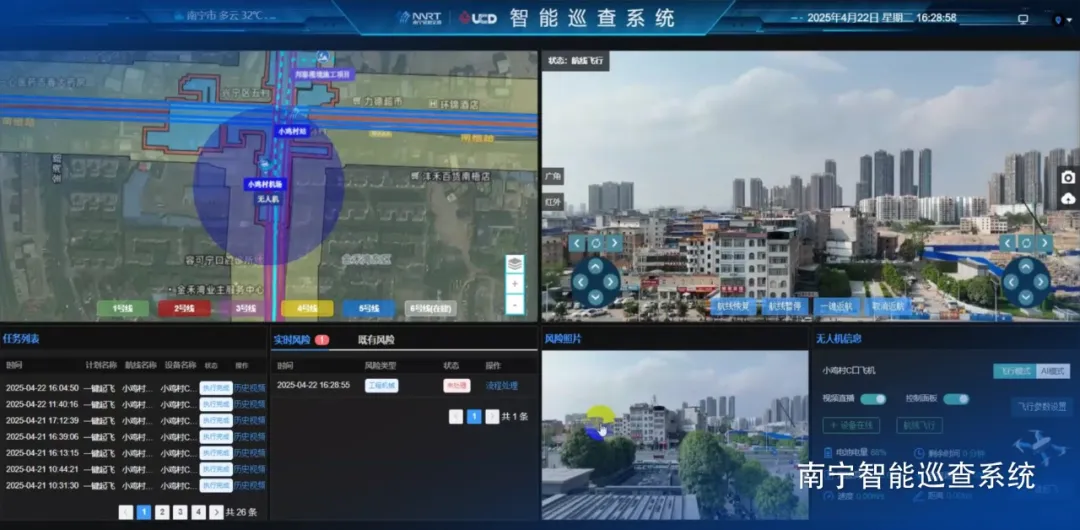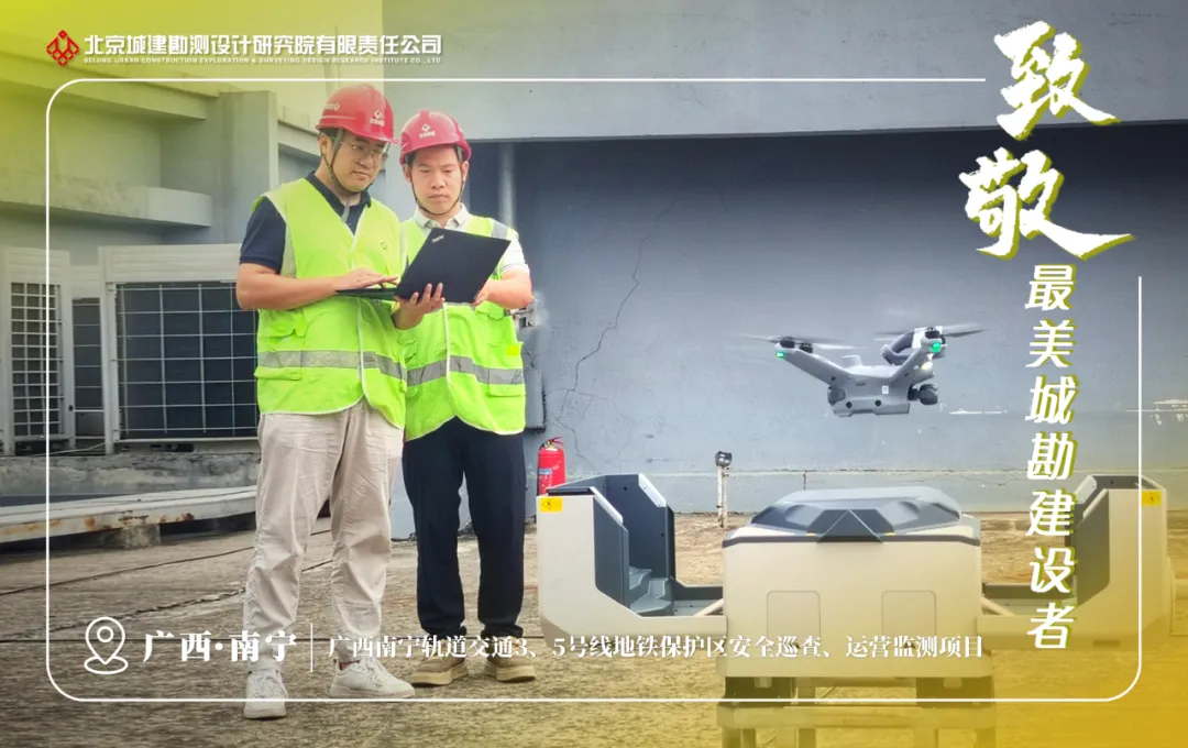 在南宁轨道交通智能巡查项目中,城勘七院南宁分院联合智慧工程院构建“无人机+AI”立体防控体系。项目团队创新采用无人机巡查与AI智能识别技术相结合的方式,精准识别出保护区内桩基设备、勘察钻机、挖掘机等高危机械和违规施工行为,隐患识别准确率达90%以上。