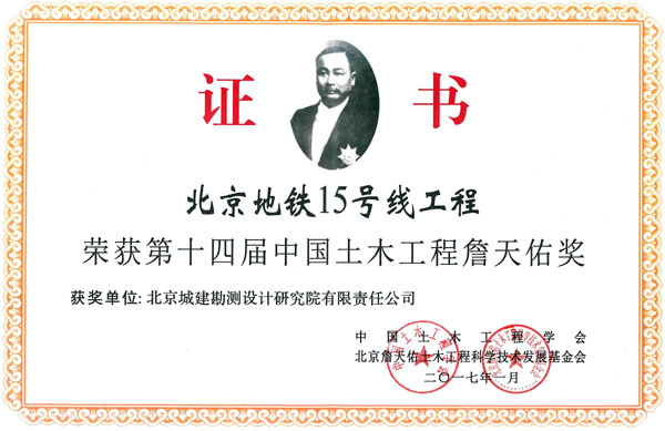 北京地铁15号线工程第十四届中国土木工程詹天佑奖获奖证书